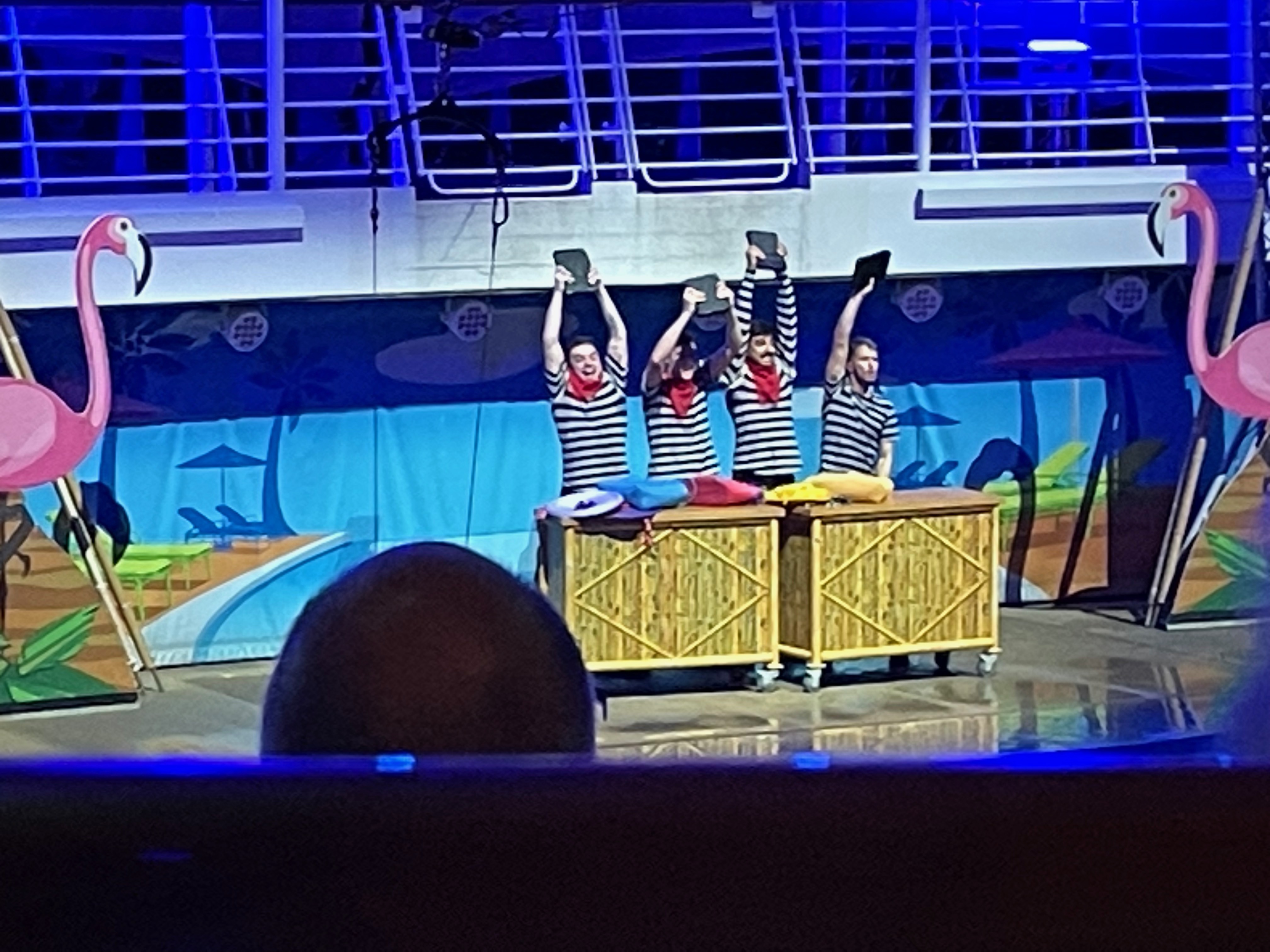 Then we're on to the Schooner Bar where Kelly has been playing for a while. He asks us where we've been! When he takes hiss break we go down to Deck 5 for a line-dancing class, then to Bolero's for Caribbean Vibes with L'Ements. Back up to the Schooner where Kelly is now playing music from the British Invasion, complete with wig and 60s attire!